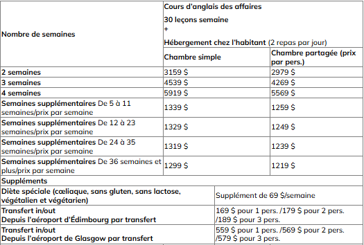 - Les cours combinés : 30 leçons/semaine (20 cours en groupe par semaine, 10 heures de cours anglais des affaires par semaine)