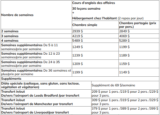 Pour les COURS D’anglais généraux pour les affaires incluant l’hébergement EN FAMILLE