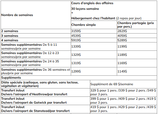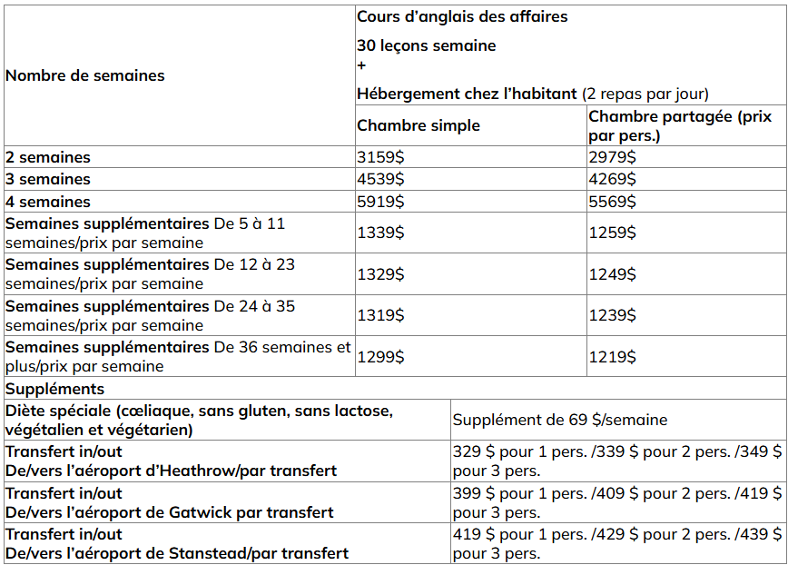 Pour les COURS D’anglais généraux pour les affaires incluant l’hébergement EN FAMILLE