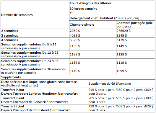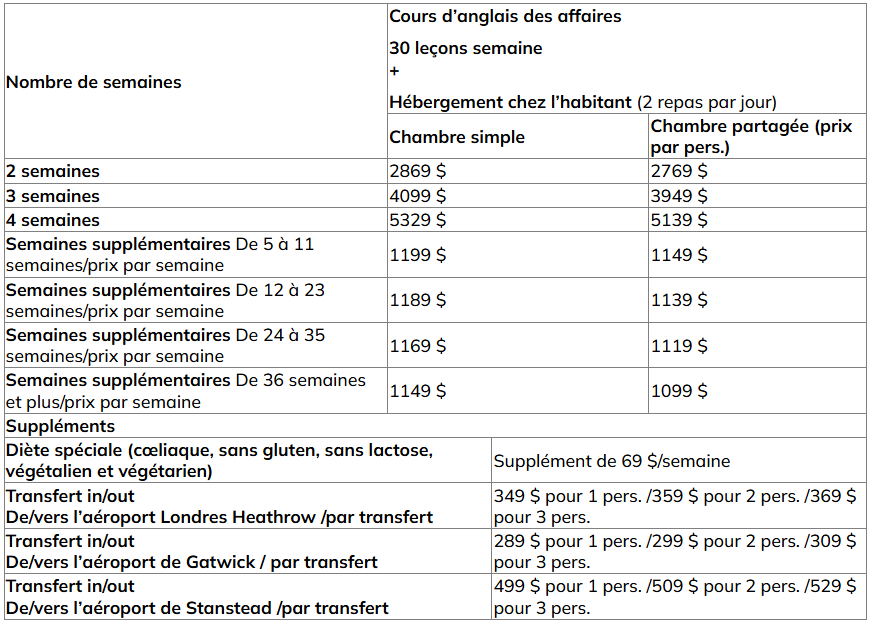 Pour les COURS D’anglais généraux pour les affaires incluant l’hébergement EN FAMILLE