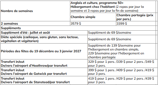 Le programme anglais et culture, programme 50+ comprend :