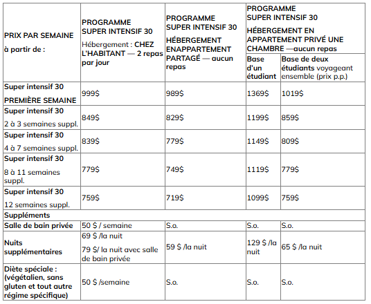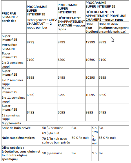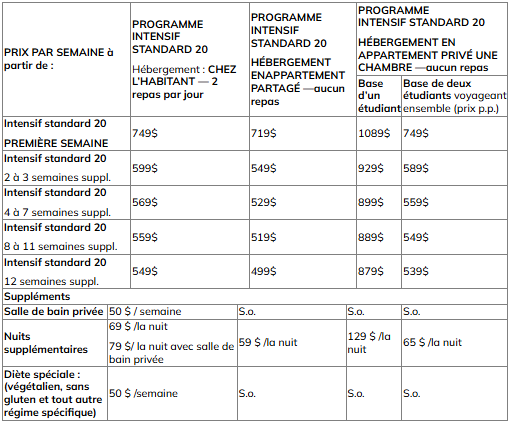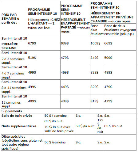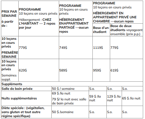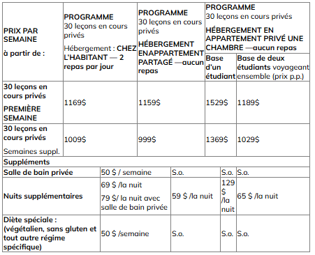 L’heure des cours est attribuée selon le test de classement. Votre horaire de cours peut changer pendant votre séjour. 13 h : Mot de bienvenue, dîner et orientation. Le personnel vous accueillera à l’école.