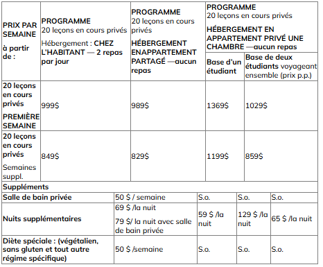 Veuillez noter : Cours de 1 heure = 50 minutes, les cours du matin ou de l’après-midi sont, selon la disponibilité et le niveau de l’étudiant. Le nombre minimum de participants pour ouvrir une classe de groupe est de deux. Dans le cas où il n’y a pas de groupe ouvert au niveau de l’élève, remplacera [pour cette semaine] les cours de groupe en cours privé pour 50 % du nombre de cours qu’il a achetés, maximum de cinq élèves par cours.