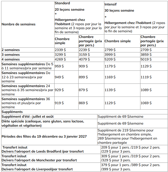 Pour les COURS D’ANGLAIS GÉNÉRAUX STANDARD et INTENSIF incluant l’hébergement EN FAMILLE