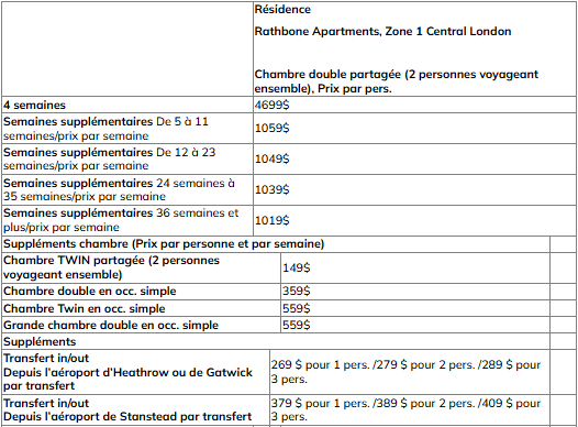 - L’hébergement en résidence. Rathbone Apartments, Zone 1 Central London (min. 4 semaines) Aucun repas inclus. choix de :