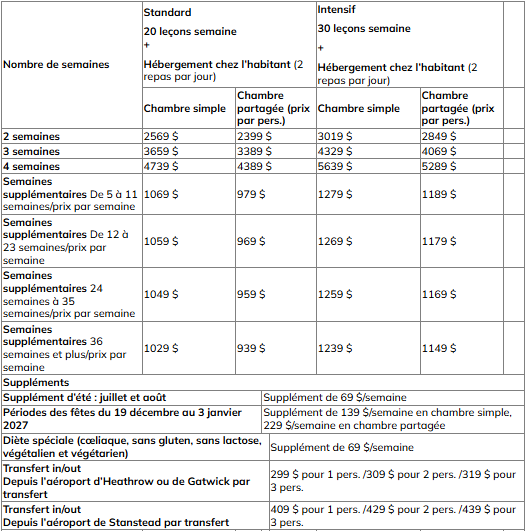 Prix 2026 pour les COURS D’ANGLAIS GÉNÉRAUX STANDARD et INTENSIF incluant l’hébergement EN FAMILLE